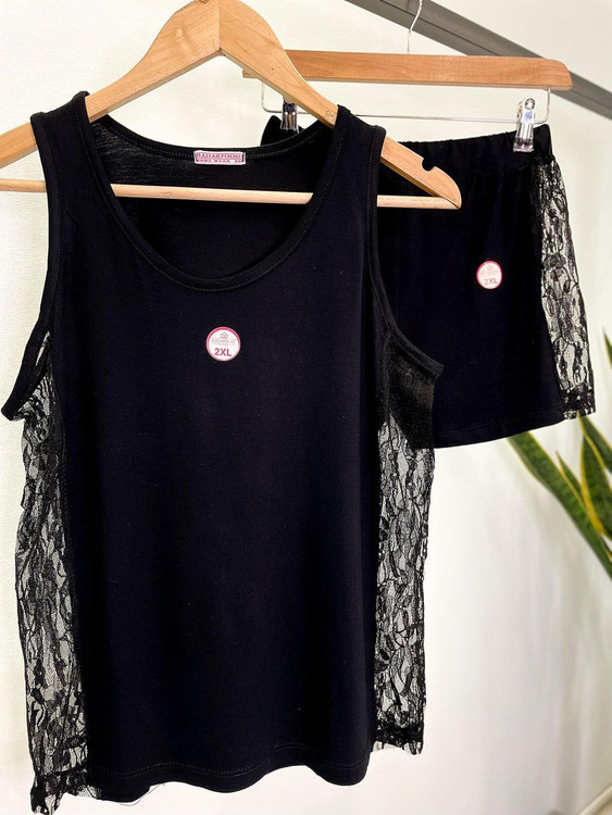 اگر به دنبال یک ست لباس راحتی زنانه شیک و خاص هستید، این مدل مشکی با طراحی ساده و گیپورهای ظریف بهترین انتخاب است. تاپ بدون آستین و شلوارک کوتاه، با پارچهای نرم و سبک دوخته شدهاند که حس راحتی بینظیری به شما میدهند.