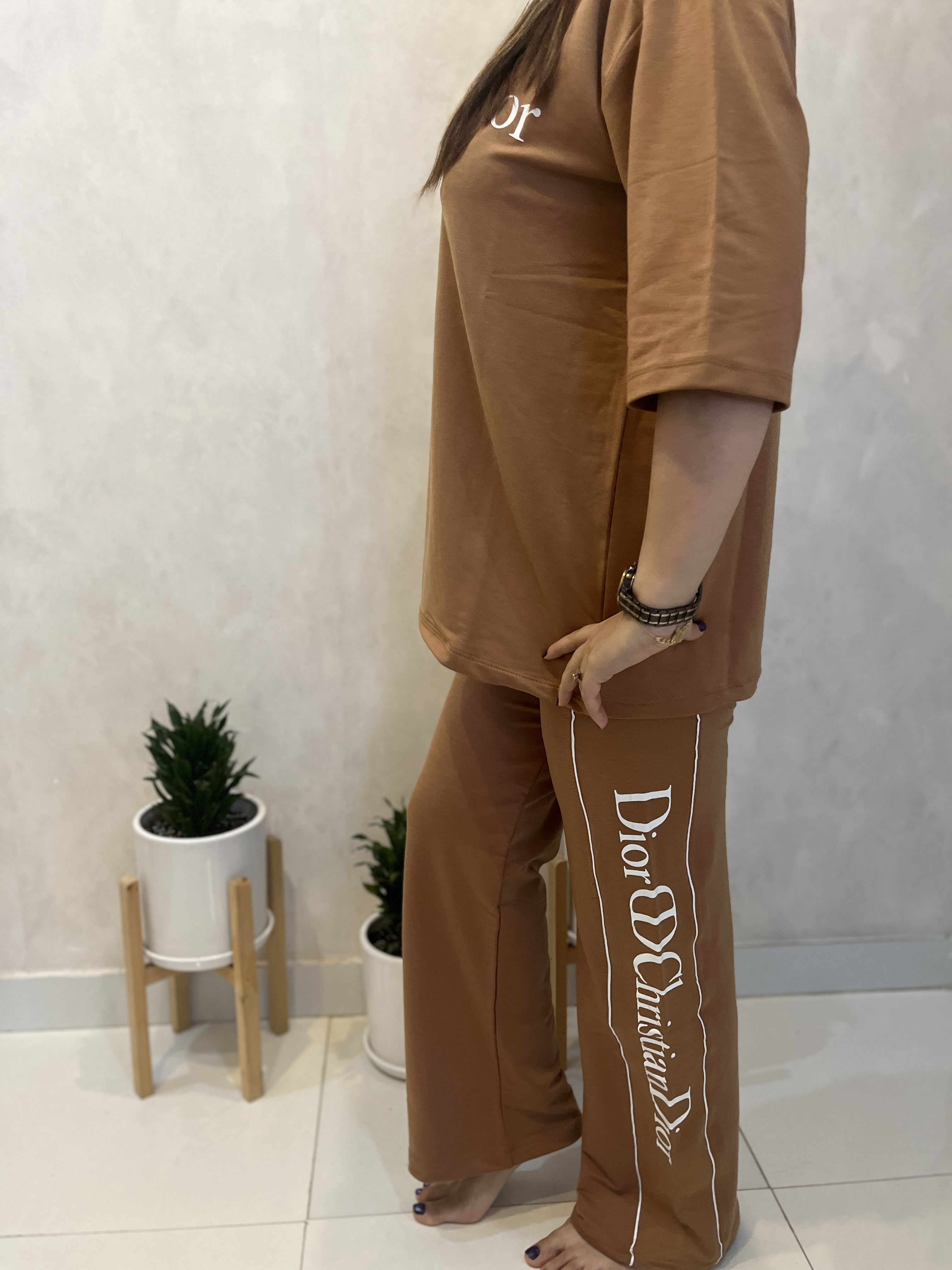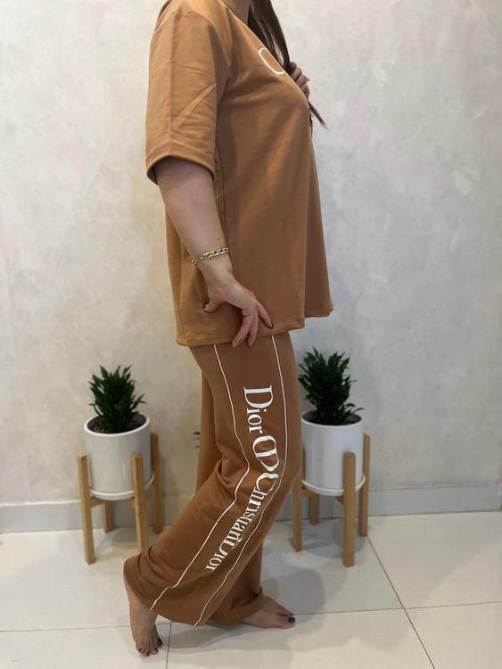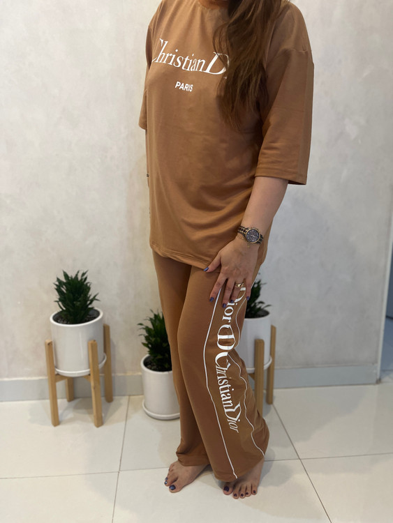 این ست شامل لانگ آستینکوتاه و شلوار همطرح میباشد که با رنگ قهوهای کاراملی ترند و چاپ برند معروف، جلوهای خاص و مدرن ایجاد میکند.